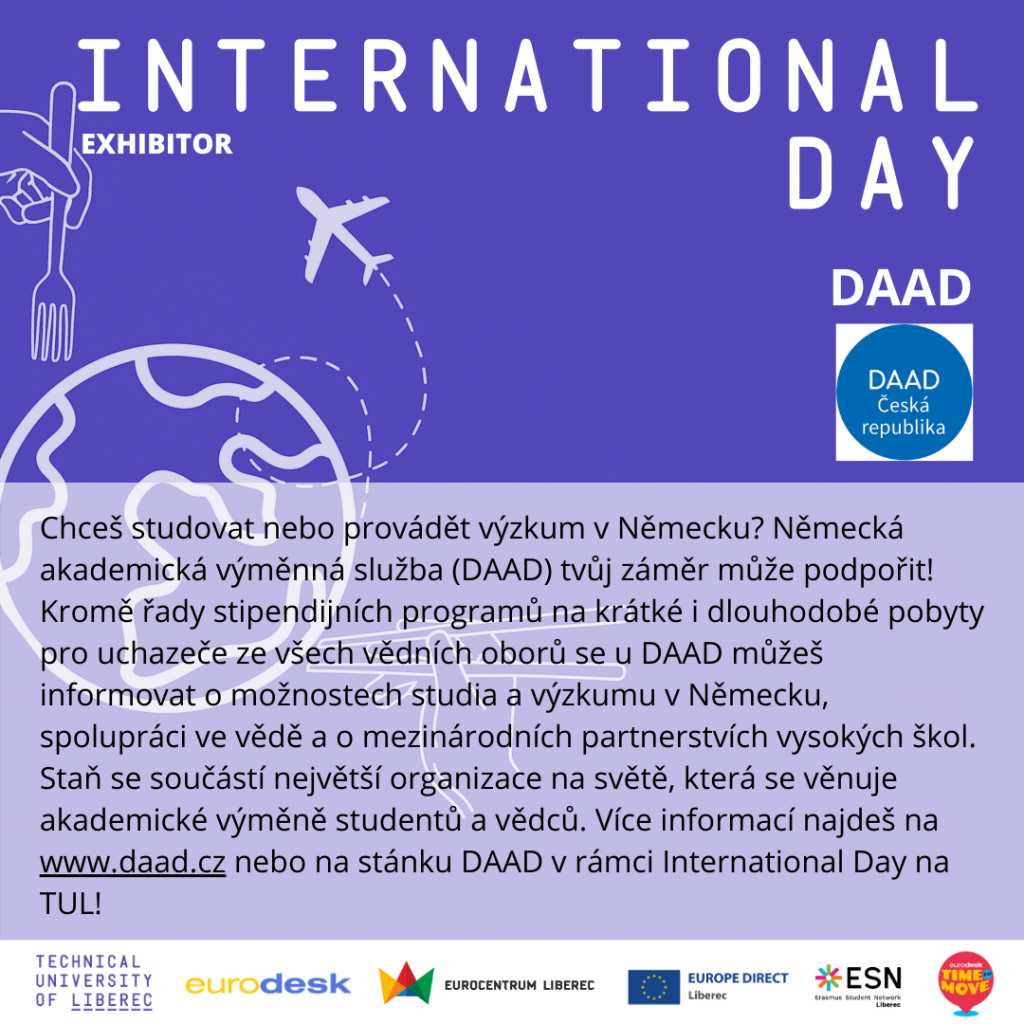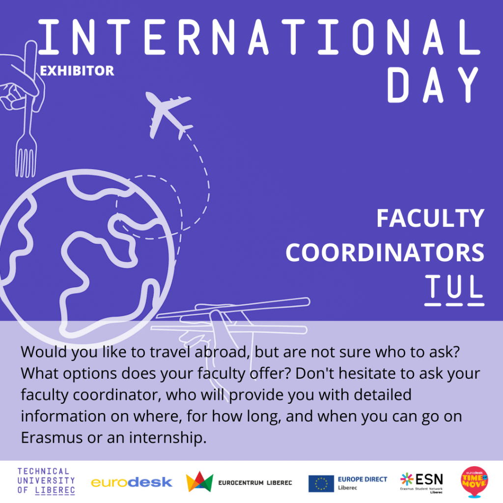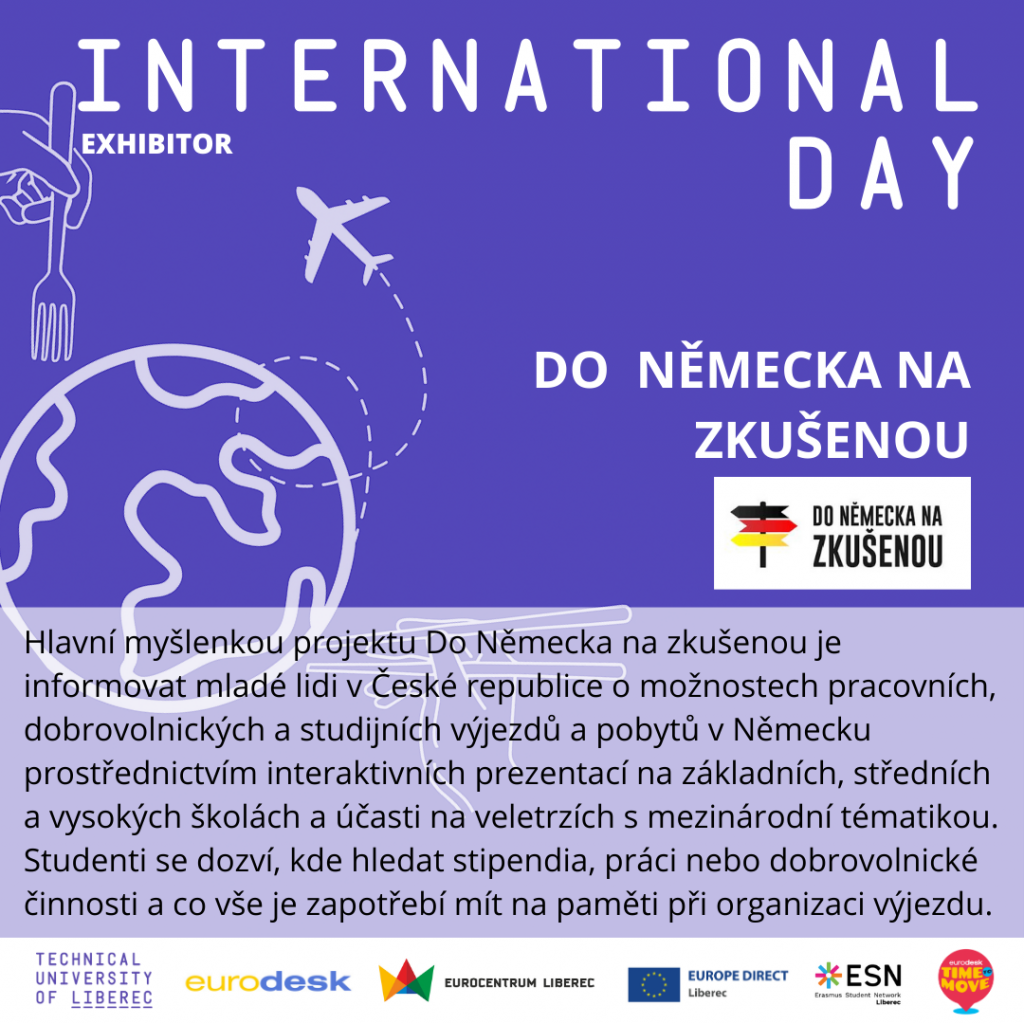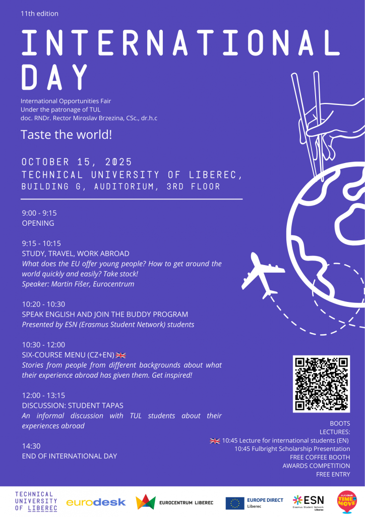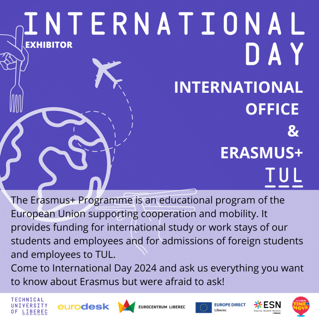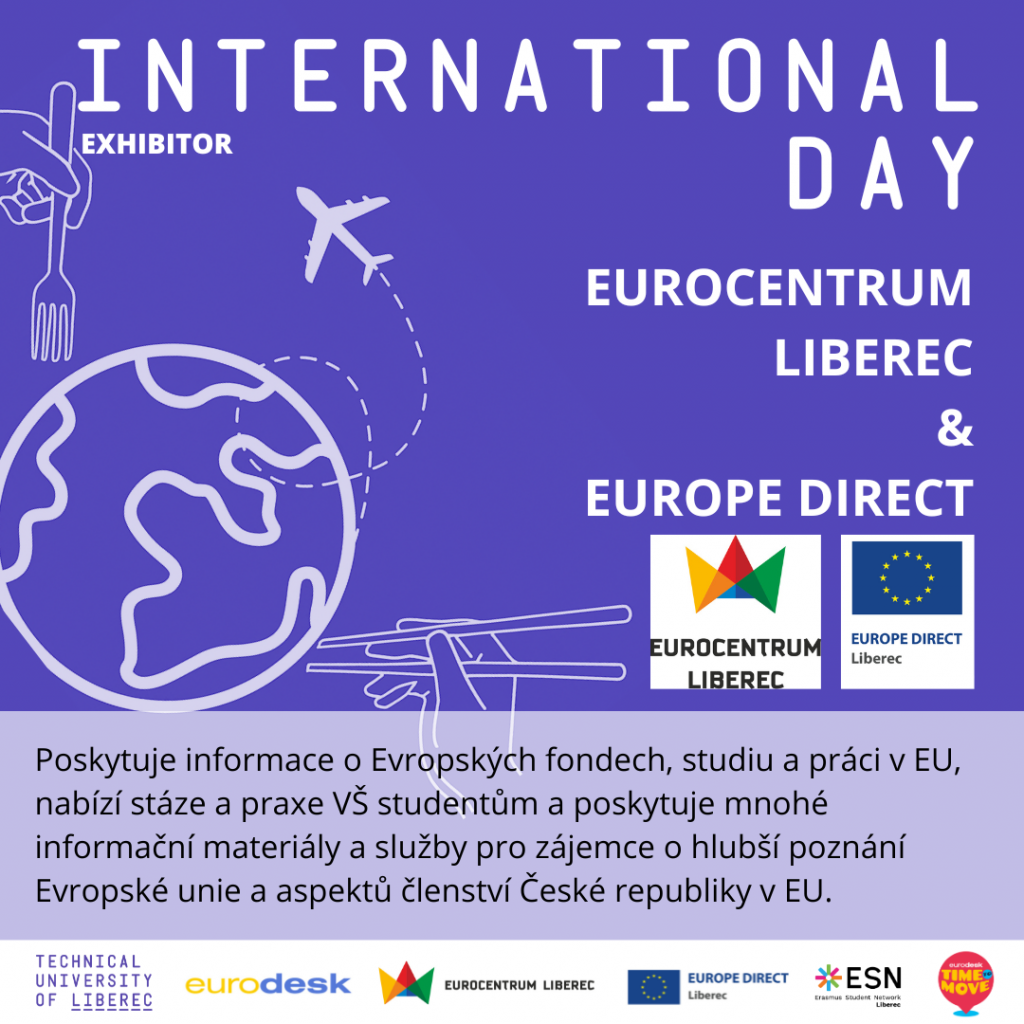 International Day is an annual event organised by the International Office of TUL, Eurocentrum Liberec and other partners. It aims to propagate foreign mobilites and internationalization of the university, education and society in general. It is a fair of opportunities (internships, study, volunteering, and working) with lectures and discussions.
