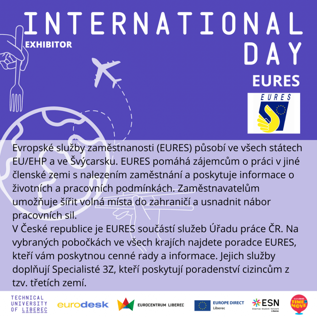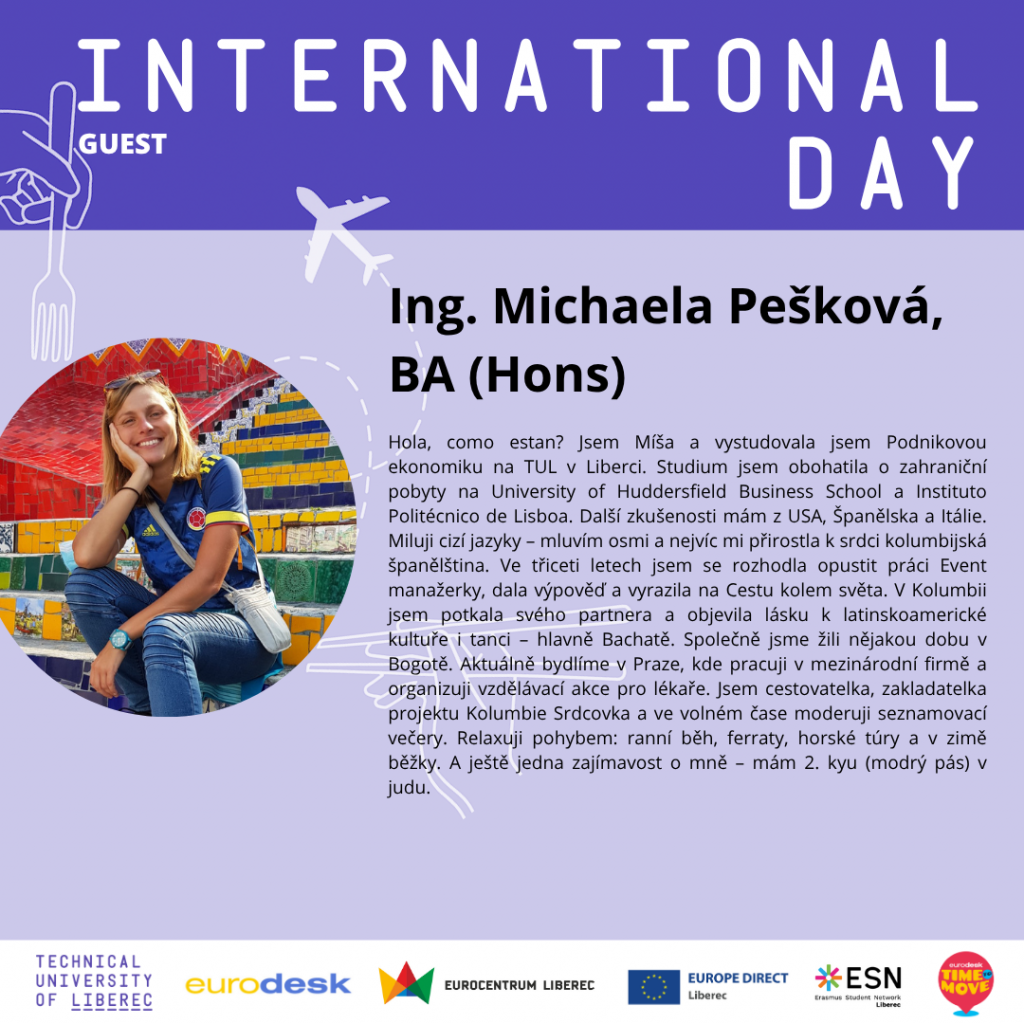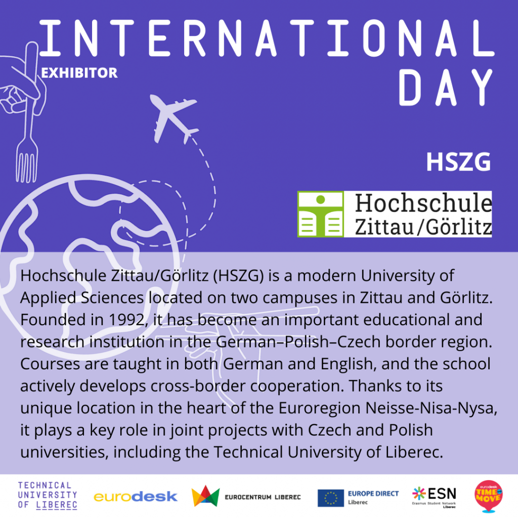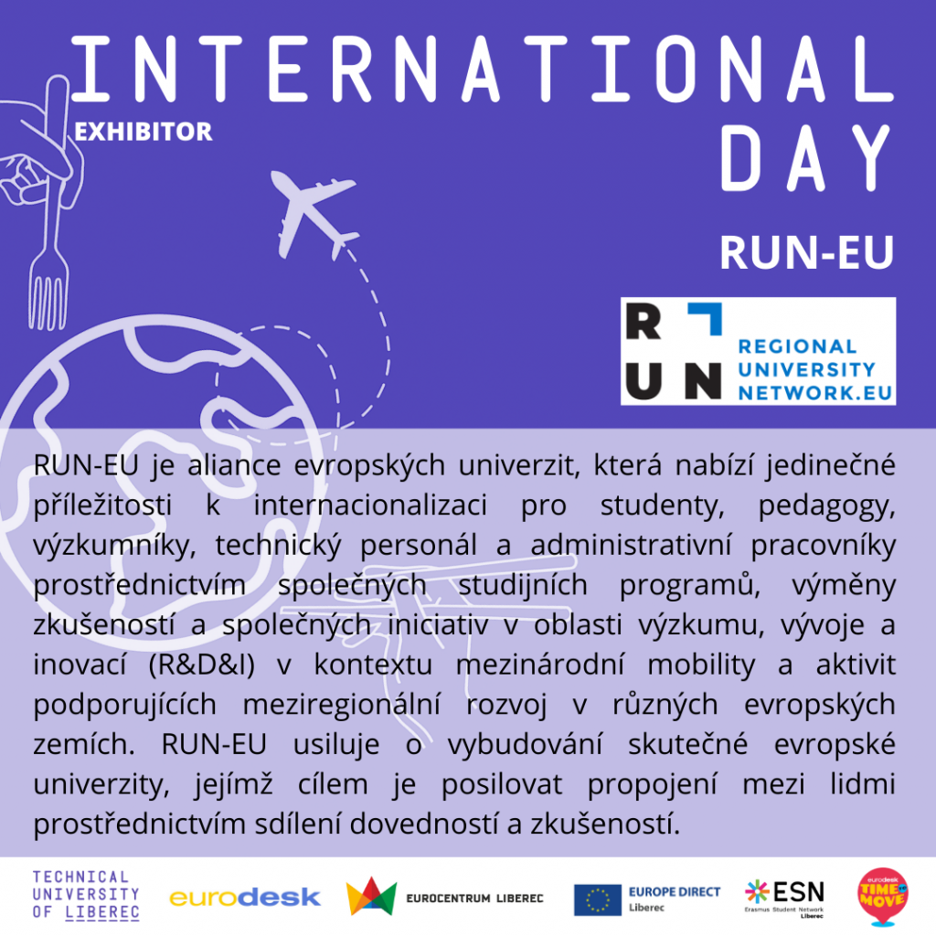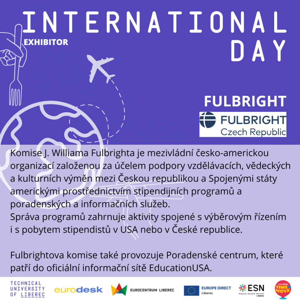 International Day is an annual event organised by the International Office of TUL, Eurocentrum Liberec and other partners. It aims to propagate foreign mobilites and internationalization of the university, education and society in general. It is a fair of opportunities (internships, study, volunteering, and working) with lectures and discussions.