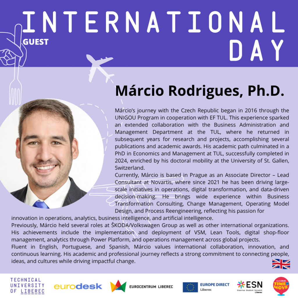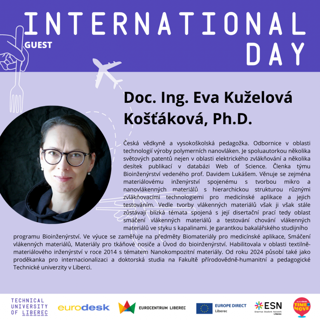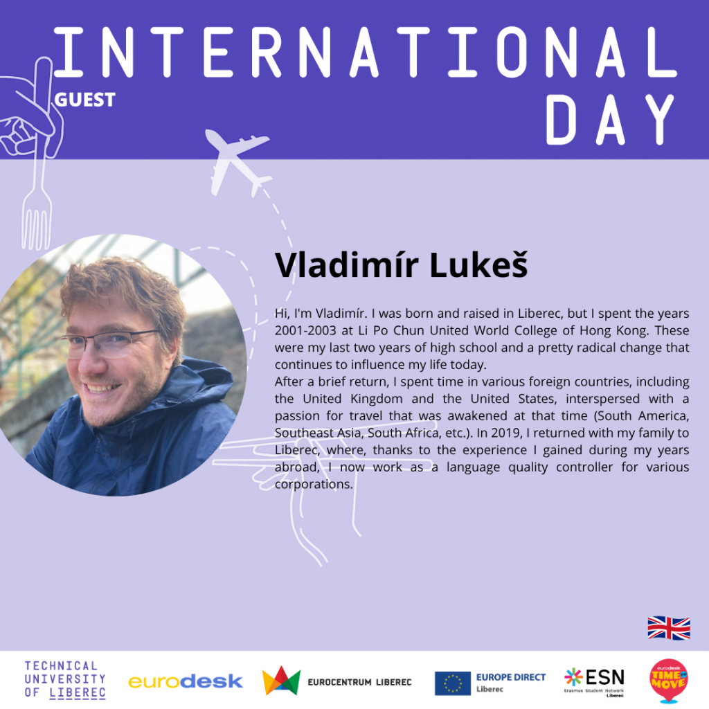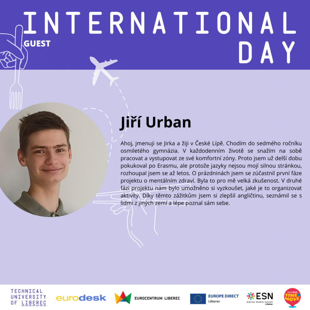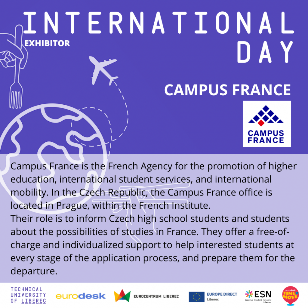 International Day is an annual event organised by the International Office of TUL, Eurocentrum Liberec and other partners. It aims to propagate foreign mobilites and internationalization of the university, education and society in general. It is a fair of opportunities (internships, study, volunteering, and working) with lectures and discussions.