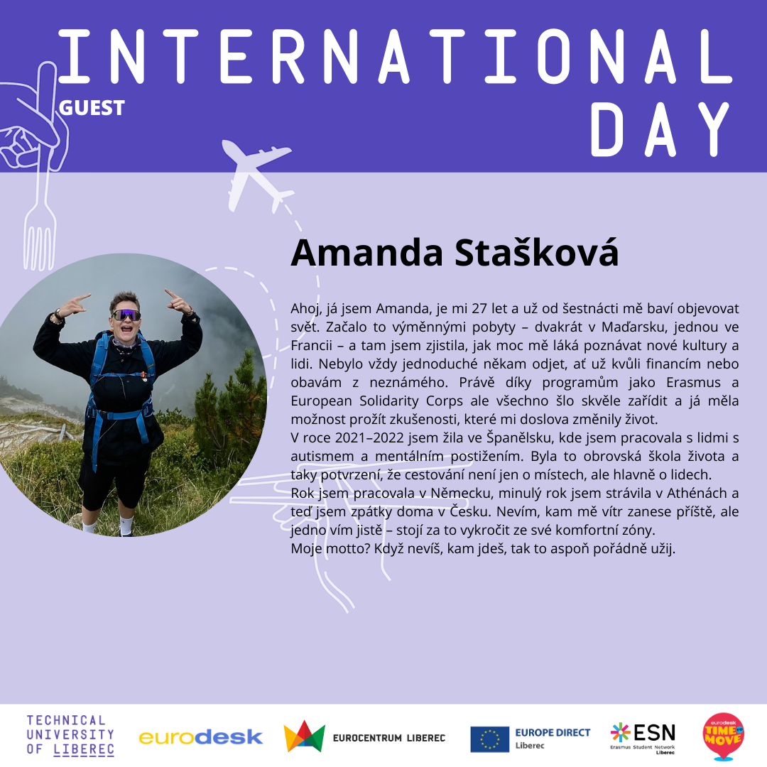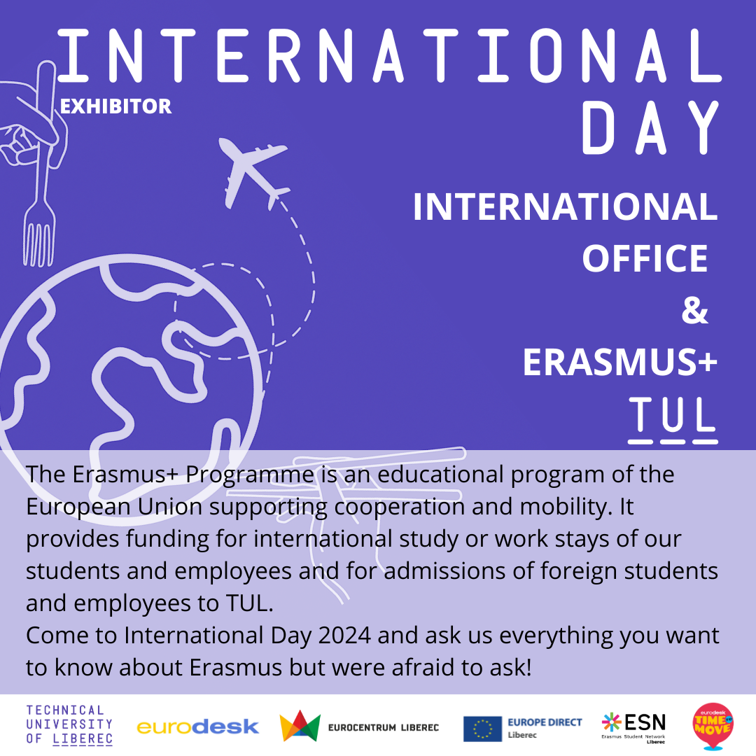 International Day is an annual event organised by the International Office of TUL, Eurocentrum Liberec and other partners. It aims to propagate foreign mobilites and internationalization of the university, education and society in general. It is a fair of opportunities (internships, study, volunteering, and working) with lectures and discussions.