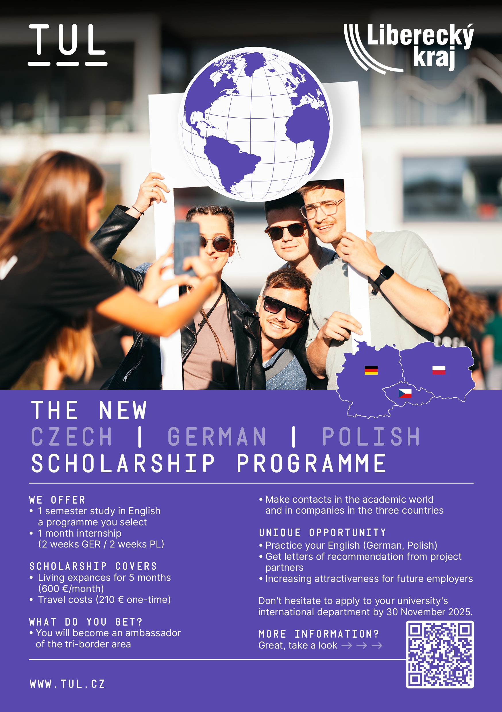 The Trilateral Scholarship Program is an international educational initiative aimed at promoting cooperation between the Czech Republic (TUL), Germany (Saxony), Poland (Lower Silesia), and global partners from Africa, Asia, and Latin America. The program is coordinated by the Liberec Region (KULK) and the Technical University of Liberec (TUL). Its goal is to explore global opportunities, identify collaboration potential in the field of innovation, and strengthen professional exchange in the trilateral border region.