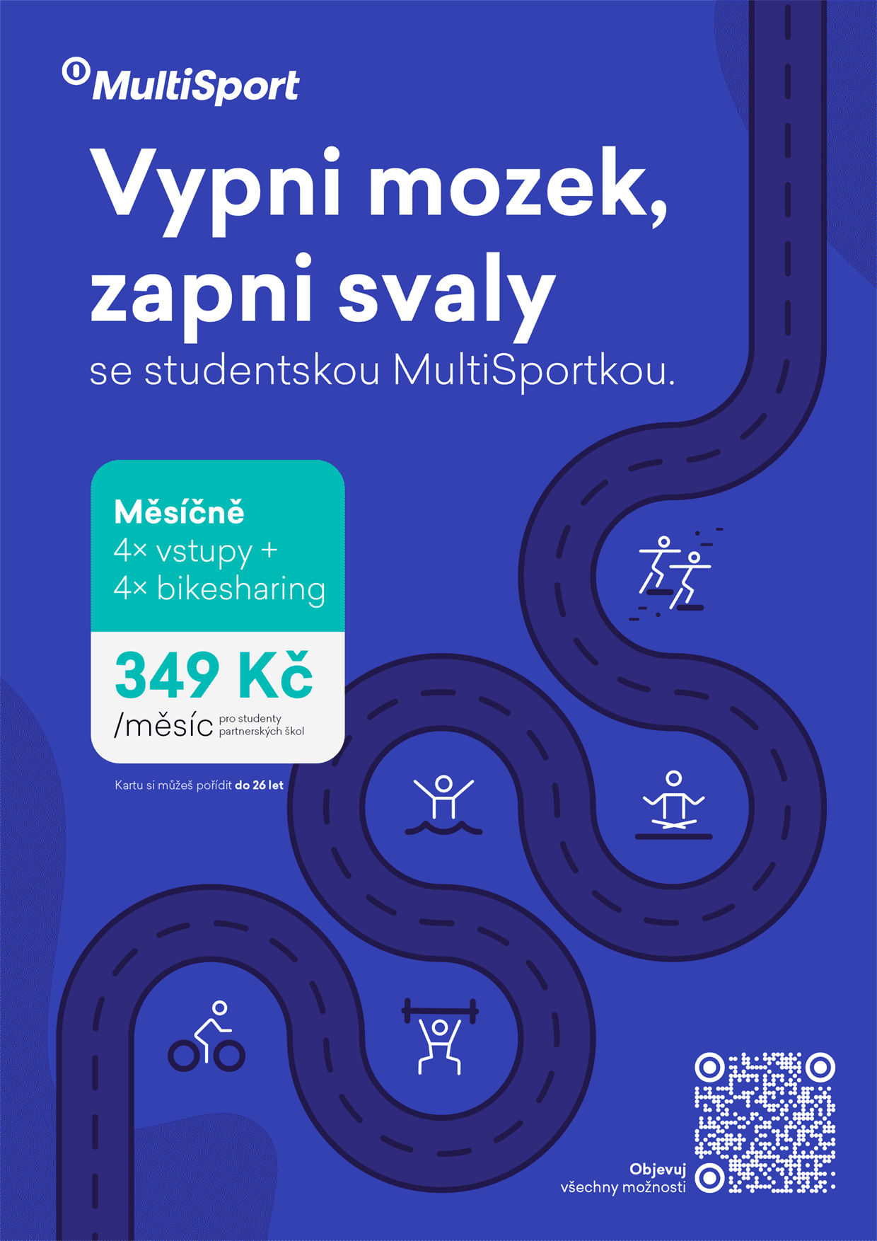 Studentská MultiSportka vám otevře dveře do 380+ sportovních a relaxačních center. Můžete s ní vyrazit do fitka nebo na skupinovou lekci, na jógu, pilates či do bazénu, pronajmout si se spolužáky kurt nebo využít jízdy na sdílených kolech.